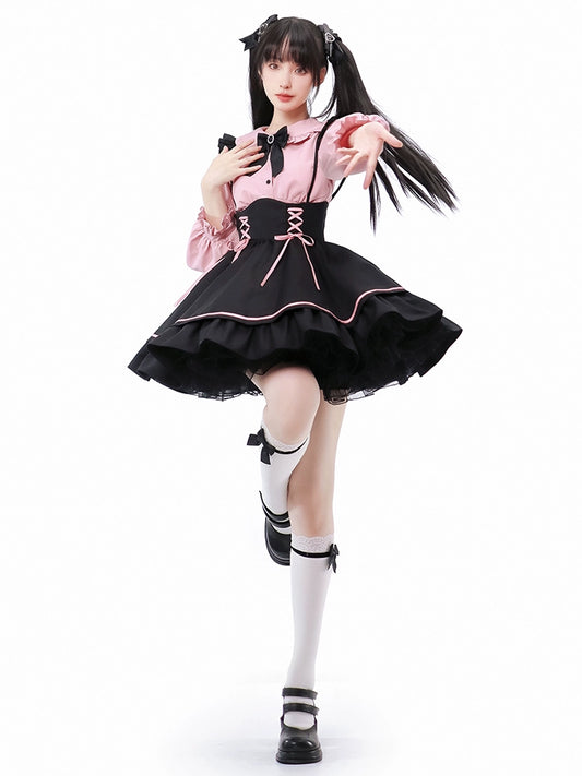 Sweet Pink Ribbon-Trimmed Blouse and Black Skirt Set